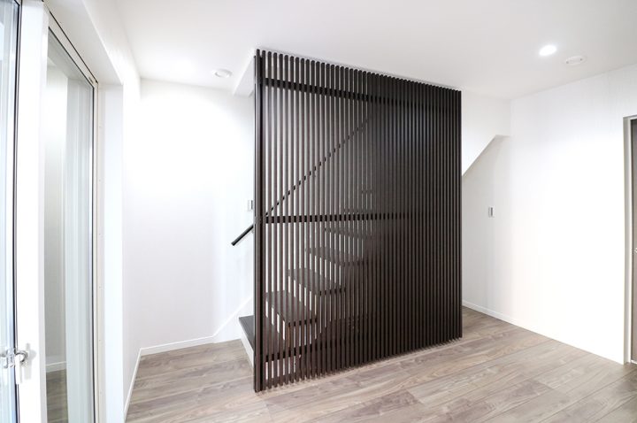 暮らしやすさとデザイン性を兼ね備えたお家です。キッチン・浴槽・洗面化粧台はハイグレードのものを採用。浴槽は1.25坪の広い浴室・洗面所も広く洗面台に収納が付いているのでスッキリ広々と暮らして頂けます。玄関・ホールも広く階段はストリップ階段に格子でスタイリッシュなデザインになりました。3階は大きなバルコニーになっており、洗濯物もたくさん干せ、BBQなどもできる広さが自慢です。デザイン性だけではなく、樹脂複合サッシや吹付断熱するなど断熱性能などもハイグレードなものを使用しました。