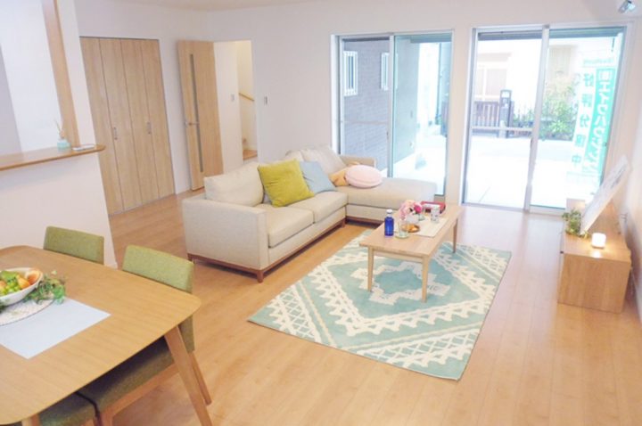 メープル柄の床材はパステルカラーとの相性も良く、観葉植物が映える優しい色合いの住空間に。